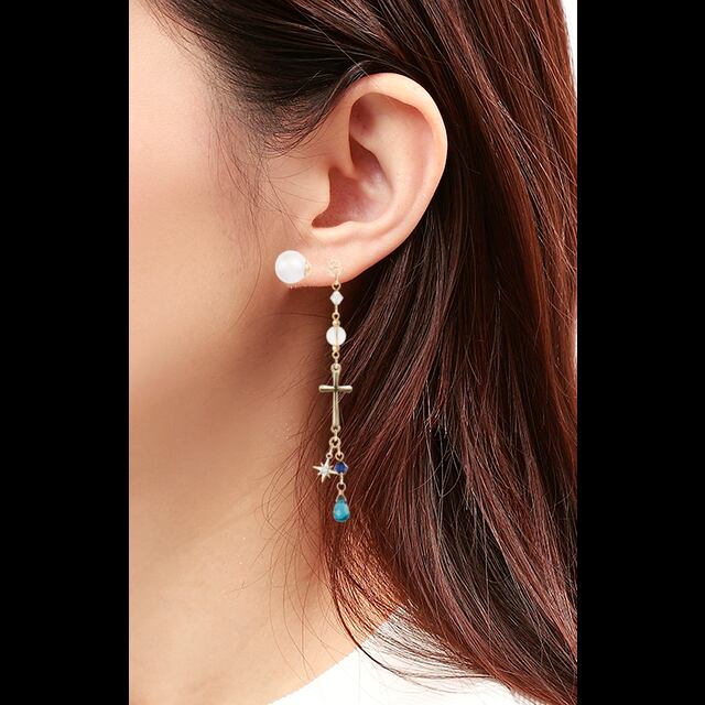このピアスは、耳元で揺れる雫型が繊細な美しさを放ち、クロスのパーツと合わさって清らかで神秘的さを演出します。