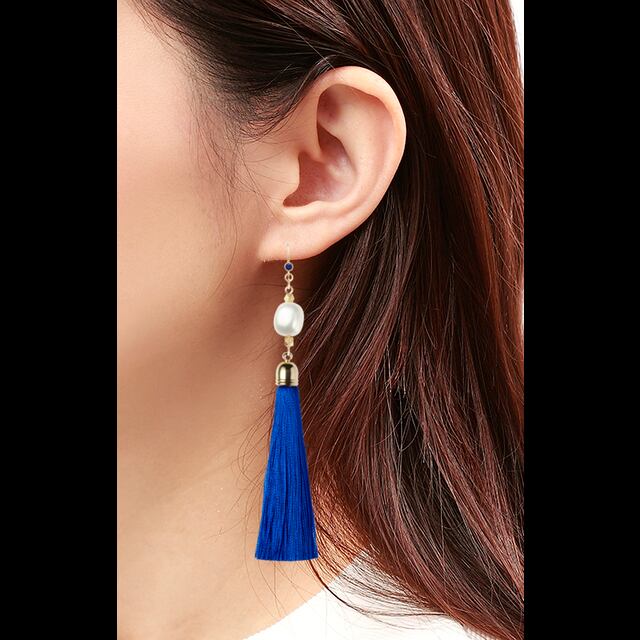 ロングタッセルが揺れる度に、女性らしい優雅さを演出してくれます。ブルーとパールのチャームがアクセントになって、清涼感たっぷりの爽やかな印象を与えます。